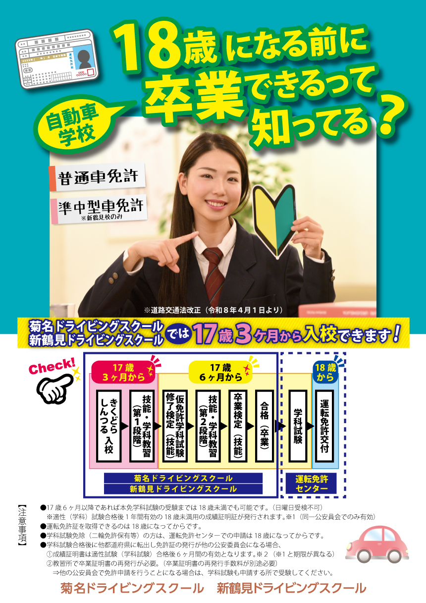 【普通車】17歳3ヶ月から入校! 18歳になる前に卒業!