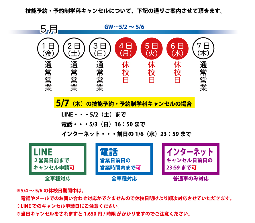 令和8年5月4日(月)から5月6日(水)までの期間、休校とさせていただきます。
