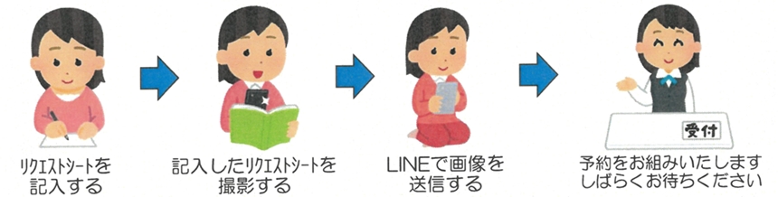 - 来校可能日時をリクエストシートへご記入いただき、LINEメッセージで画像をお送りください。
