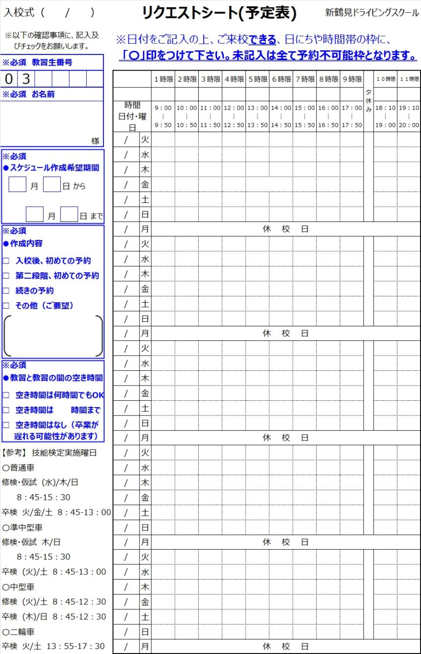- リクエストシートの送信はお早めにお願いいたします。送信が遅れますと、予約が取りづらくなります。