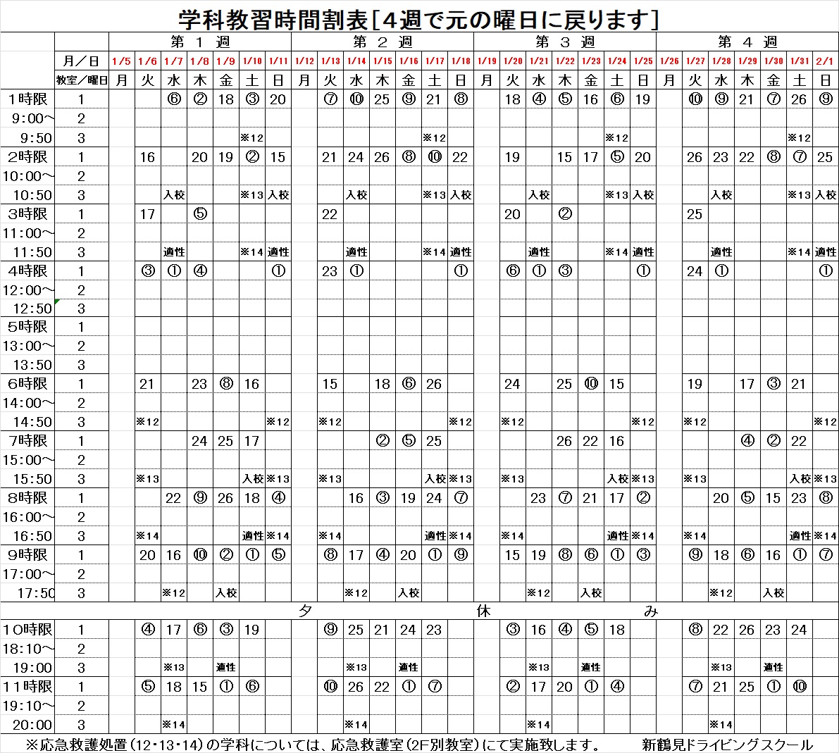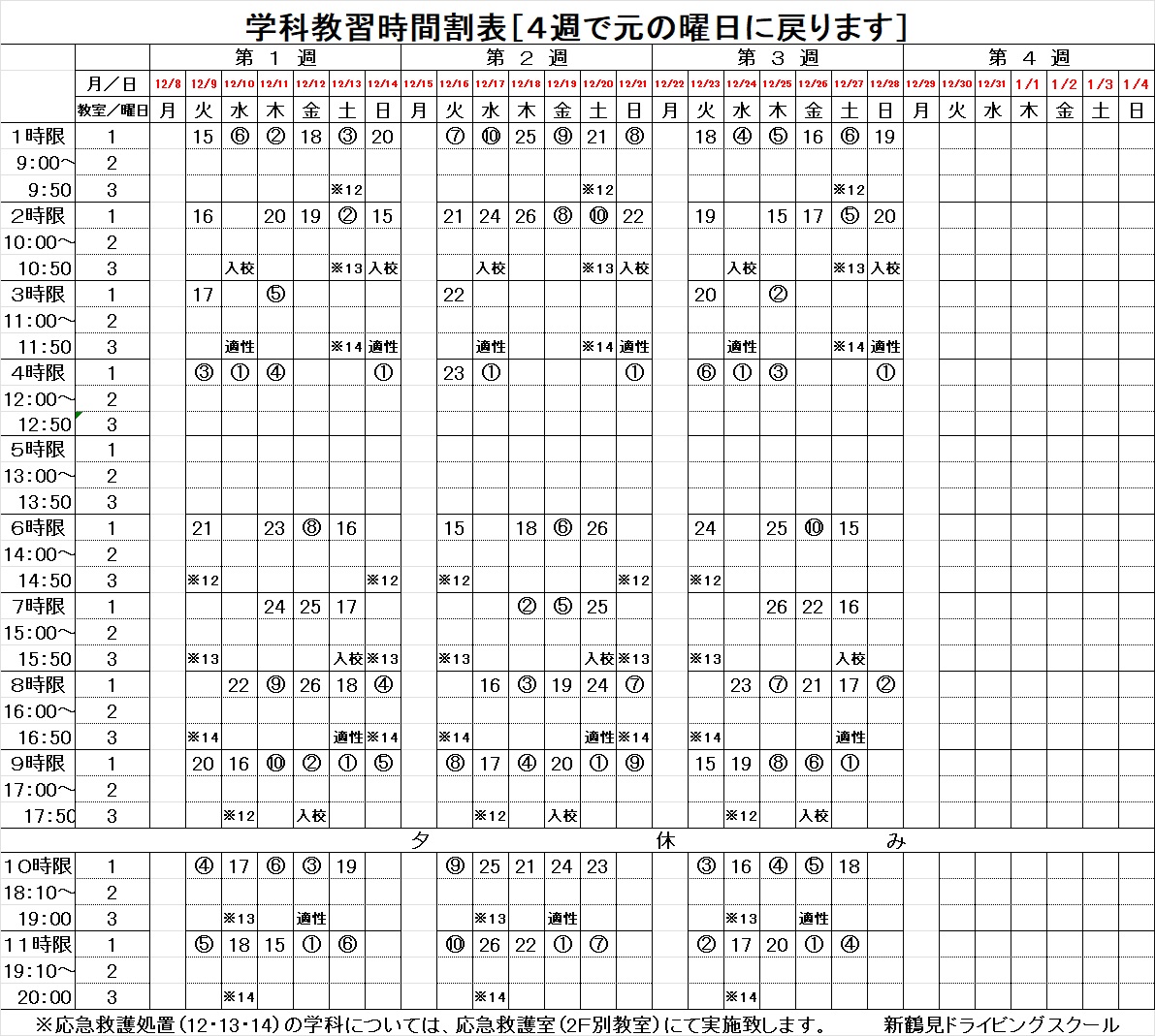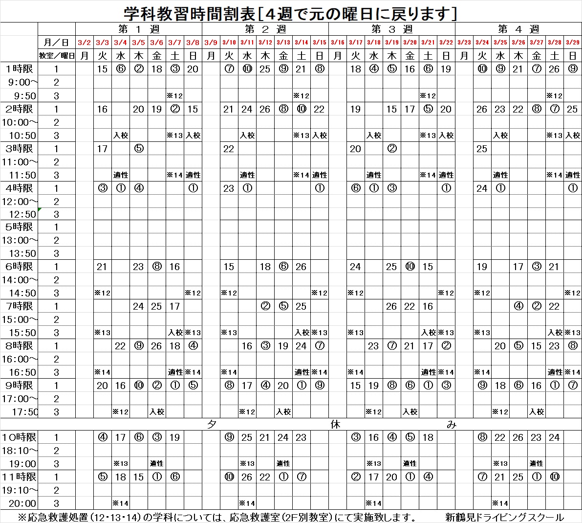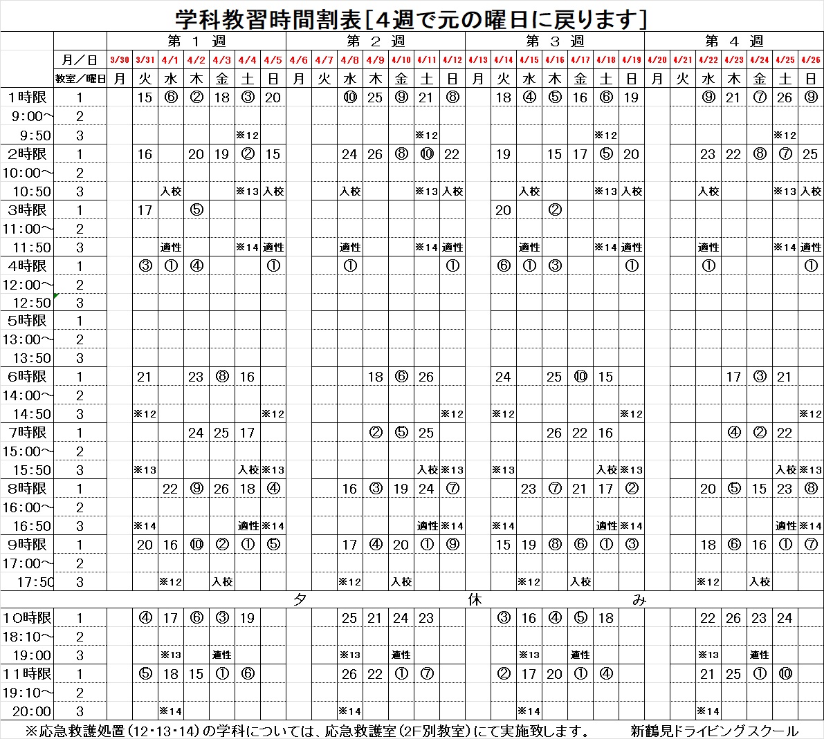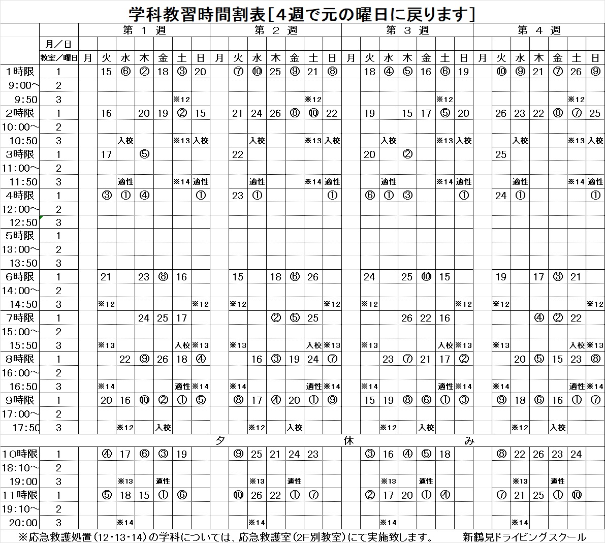 ※『今日の学科』については、校舎1階ロビーに掲示してあります学科教習時間割表にも表示されています。